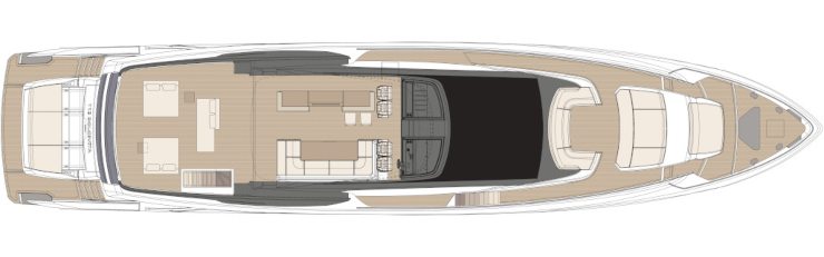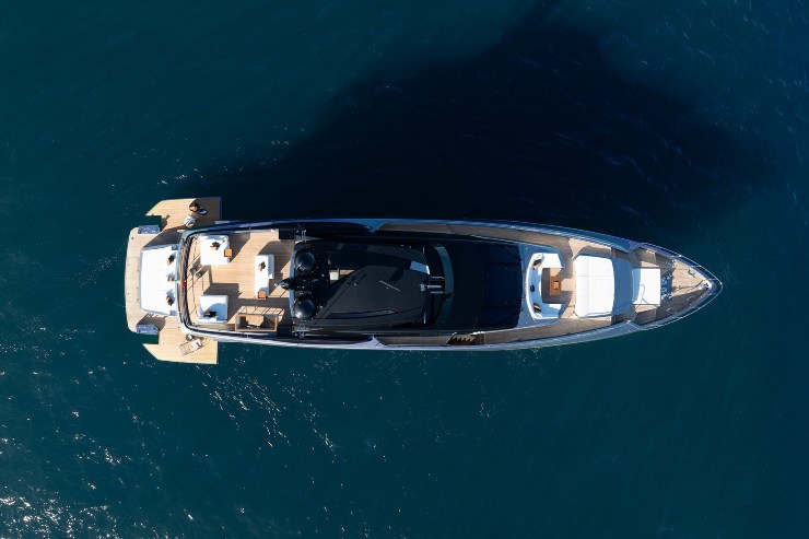 - Esterni: flybridge abitabile con aree dining e prendisole, prua vivibile con lounge integrata, beach club con piattaforma bagno ampliata per water toys.