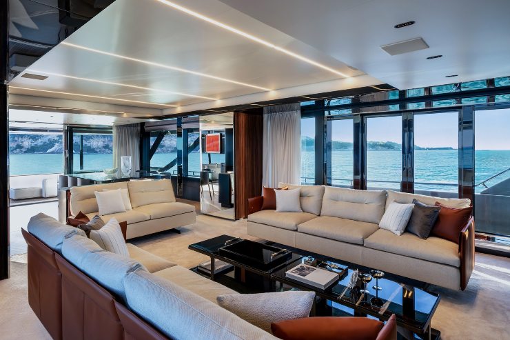 La firma stilistica Dolcevita Super è un continuum vetrato che allunga la silhouette, integrando montanti scuri e superfici specchiate per alleggerire otticamente i volumi. Il main deck ospita un salone a tutta larghezza percepita grazie alle vetrate a tutta altezza: la scansione dei pieni e dei vuoti guida naturalmente i percorsi, creando un’asse prospettica che dalla lounge proietta lo sguardo verso il beach club.