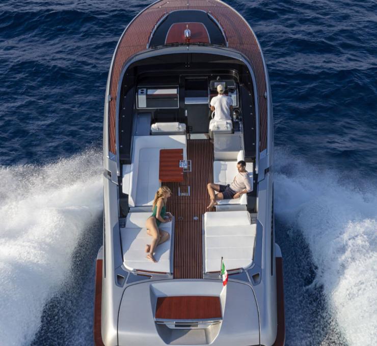 La carena è dichiarata a geometria variabile con pattini di sostentamento e deadrise poppiero di circa 15,9°. In termini pratici, significa un’impostazione planante moderna: pattini e spray rails lavorano per aumentare portanza e stabilità di rotta, riducendo bagnato e spruzzi; il deadrise non esasperato mira a una planata efficiente e a un comfort “da gran turismo”, senza inseguire l’estremo offshore di certe carene deep-V più acute. È una scelta coerente con l’identità del modello: veloce, sì, ma soprattutto composto, asciutto e fruibile.