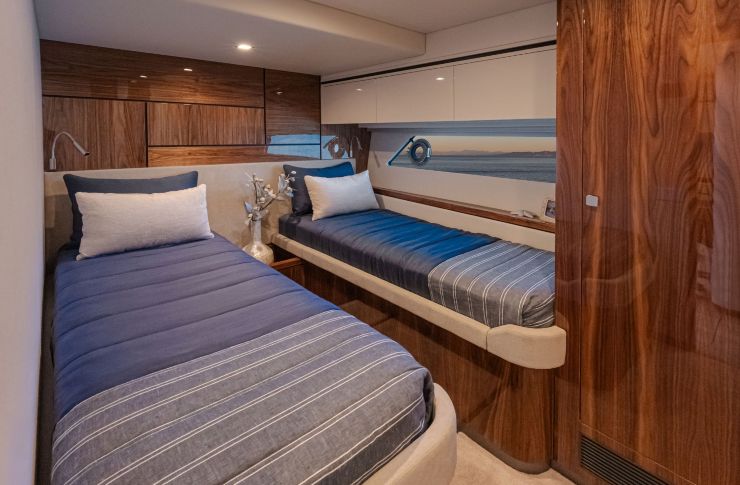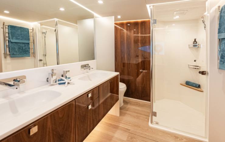 La zona notte è uno dei punti più convincenti del modello, perché dimostra una gestione matura delle proporzioni. La master full-beam è pensata come una vera suite: ampia, luminosa, con stivaggi importanti e un bagno che, per dimensioni e qualità percepita, si colloca ai vertici del segmento. È una scelta che parla all’armatore privato che vive la barca per settimane, non solo per weekend.