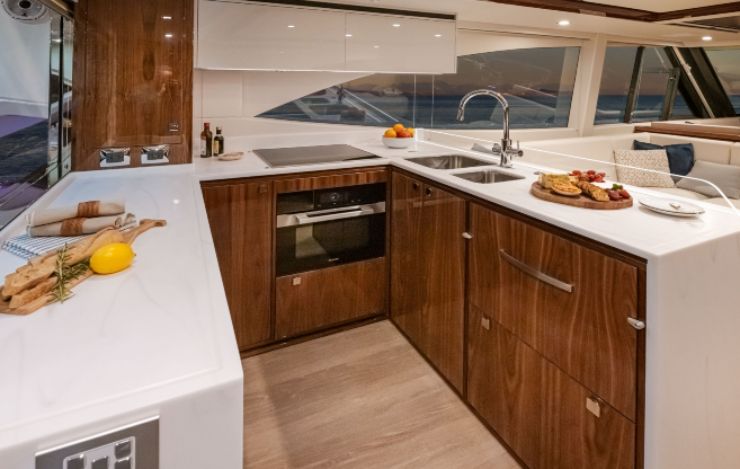 Il pozzetto è concepito come un vero “centro” dell’imbarcazione: protetto da hard-top esteso, con la possibilità di creare un grande open space grazie alla finestra cucina apribile e alle ampie aperture verso il salone. La cucina, a U, è una scelta tecnica: consente di lavorare con appoggi continui, stivaggio efficiente e una sicurezza superiore in navigazione rispetto a soluzioni lineari più scenografiche ma meno funzionali.