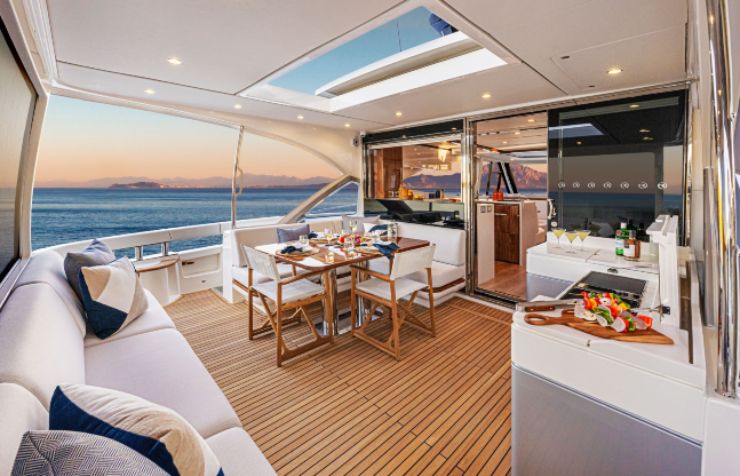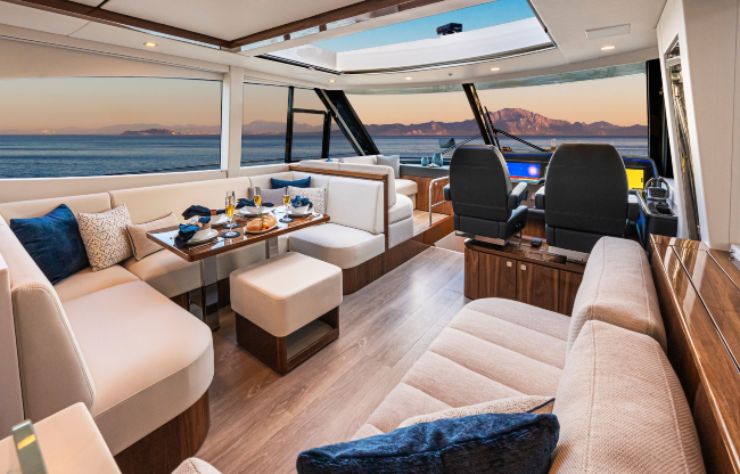 La sovrastruttura adotta ampie superfici vetrate e un hard-top progettato per un uso “quattro stagioni”: protezione quando serve, apertura quando il meteo lo consente. Qui la tecnica incontra la fruibilità: vetri, guarnizioni, cinematismi e drenaggi sono dettagli apparentemente marginali che, nella pratica, definiscono la qualità quotidiana di uno yacht.