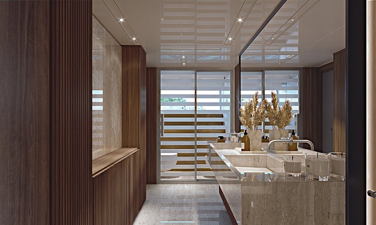 Lo stile esterno nasce in stretta collaborazione con Zuccon International Project, che ha guidato la ricerca su proporzioni e “pieni/vuoti”, enfatizzando la leggibilità delle falche con tagli netti che alleggeriscono la massa della sovrastruttura. La suite armatoriale — fulcro concettuale — è pensata come “private apartment” su tre livelli con aree indoor/outdoor e piscina privata, soluzione che sposta l’epicentro della vita di bordo verso la prua del ponte principale, liberando percorsi e gerarchie tra ospiti e servizio.