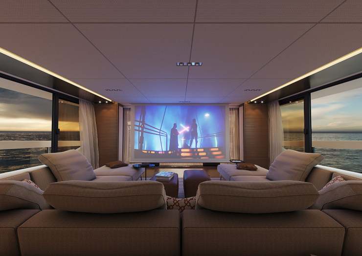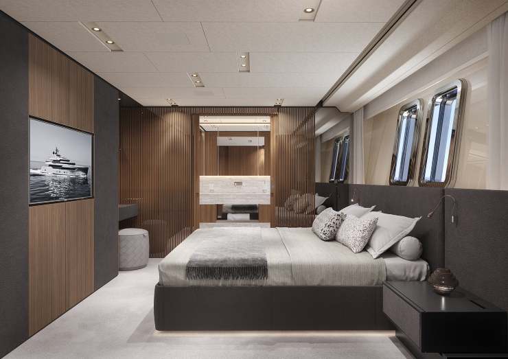 Arredi e finiture variano in funzione del design team scelto dall’armatore: i primi esemplari mostrano internamente firme diverse, dall’approccio essenziale di Zuccon a interpretazioni di studi come Studio ASH e Liaigre, testimonianza della estrema personalizzazione possibile. La luce naturale è protagonista: superfici vetrate a tutta altezza e riflessioni controllate estendono visivamente i volumi, mentre i materiali (legni a poro aperto, pietre alleggerite con supporto honeycomb, metalli satinati) compongono palette coerenti con l’identità esterna.