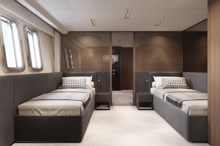 Sanlorenzo 44Alloy – ponte principale – sanlorenzoyachts.com - Ponte inferiore: quattro cabine ospiti (due VIP a tutto baglio e due doppie convertibili), locale beach club con terrazze laterali apribili su tre lati, lavanderia e cold rooms. Percorsi equipaggio isolati per garantire hotelling efficiente.