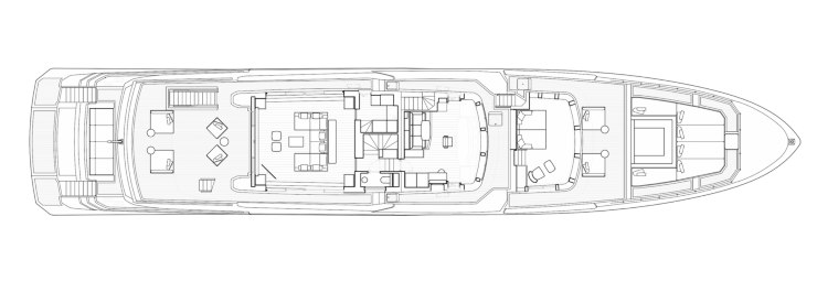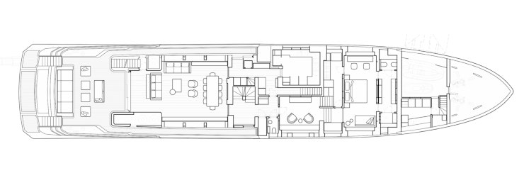 - Ponte principale: salone con aperture a tutta altezza, dining per 10, lobby centrale e galley professionale con accessi di servizio segregati. Avanti, l’appartamento armatoriale con lounge, studio, cabina padronale, walk-in e spa bathroom, oltre a terrazze abbattibili e plunge pool privata.