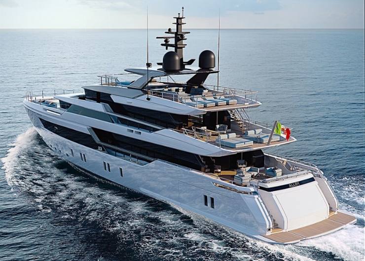 Con i suoi 44,50 metri di lunghezza per 9 metri di baglio, il 44Alloy opera nella parte alta del segmento sub-500 GT, ambito in cui le scelte volumetriche sono cruciali per rimanere entro la soglia regolamentare, preservando allo stesso tempo ambienti generosi. Il cantiere adotta una carena fast displacement in alluminio con prua fine e piani di sostentamento ottimizzati per ridurre resistenza viscosa e d’onda ai regimi di crociera più utilizzati; la volumetria poppiera e le sezioni a V moderata sono calibrate per equilibrare comfort seakeeping e risposta dinamica.