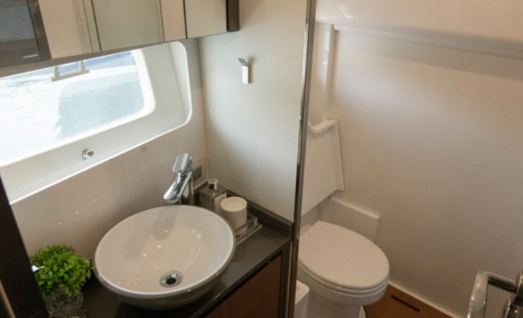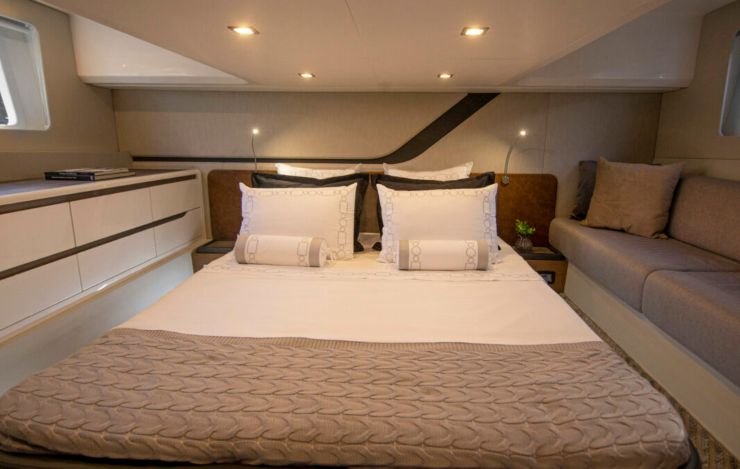 La cabina armatoriale è posizionata a mezza nave e sfrutta per intero il baglio della barca, con grandi finestrature laterali che portano luce naturale e vista diretta sul mare. Il letto matrimoniale centrale è accessibile da entrambi i lati, affiancato da comodini, armadi guardaroba e una zona vanity o piccola scrivania. Un bagno privato con box doccia separato, lavabo di design e toilette elettrica completa il livello di comfort atteso in un 50 piedi.