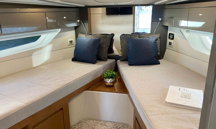 Verso prua si sviluppa la cabina VIP, con letto matrimoniale centrale o a V (in base all’allestimento), armadi e gavoni ricavati sotto i paioli. Anche qui il bagno ha accesso diretto e box doccia separato, permettendo a due coppie di godere di privacy quasi equivalente. Una terza cabina opzionale, con letti in piano sovrapposti, può sostituire parte degli spazi di stivaggio o della zona servizi sul lower deck.