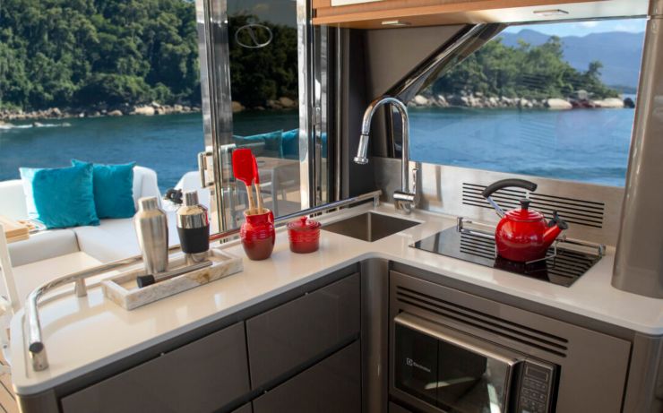 La cucina è equipaggiata con piano cottura elettrico a due fuochi, forno combinato, frigorifero con congelatore e ampi spazi di stivaggio, oltre a piani di lavoro in materiale composito. Lo stile è contemporaneo, con superfici verticali laccate, controsoffitti illuminati e inserti in acciaio che richiamano i dettagli degli esterni.