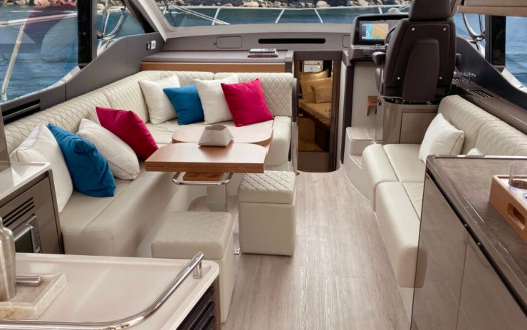 L’accesso al salone avviene tramite una ampia porta in vetro scorrevole, pensata per massimizzare la continuità tra pozzetto e interni. Il layout del main deck prevede un grande divano a L a sinistra con tavolo da pranzo trasformabile, mentre a dritta trova posto la cucina, a ridosso dell’ingresso, in posizione strategica per servire sia l’interno sia il pozzetto.