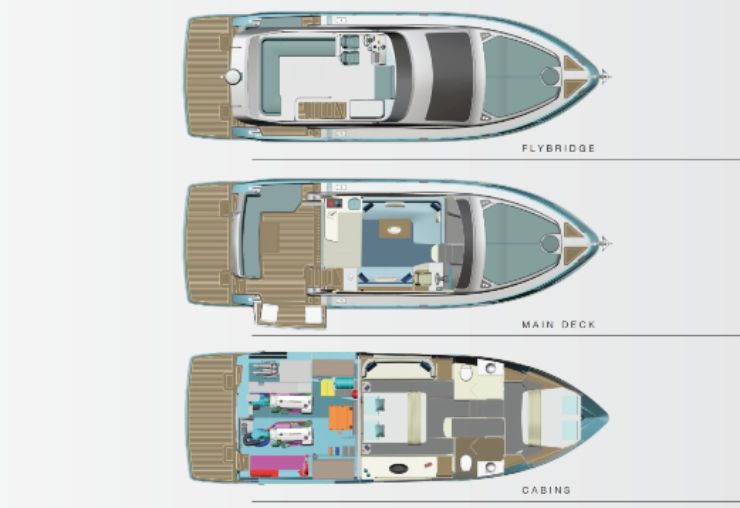 Con due cabine, due bagni e cabina equipaggio (o terza cabina a seconda dell’allestimento), la 450 Fly è proposta come yacht armatoriale gestibile senza equipaggio, ma che non sfigura nel charter di lusso di piccola taglia. Le motorizzazioni di riferimento sono le Volvo Penta D6/D8 con trasmissioni IPS, affiancate in alcuni mercati da alternative entrofuoribordo o, in prospettiva, da una versione fuoribordo tripla, a conferma della vocazione innovativa del marchio.