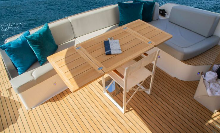 La zona di poppa ruota attorno alla piattaforma bagno idraulica, capace di immergersi per facilitare l’alaggio del tender o l’accesso al mare, e al balcone abbattibile sul lato dritto, che estende il pozzetto creando una vera terrazza sull’acqua. Il living esterno comprende un divano a “L” con tavolo in teak, mobili di servizio e una “gourmet area” con grill, lavello e frigorifero, ideale per lunghe soste in rada.