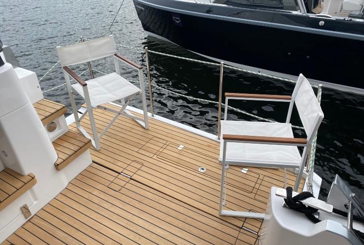 La possibilità di aprire completamente la porta di poppa e le grandi finestrature laterali trasforma il main deck in un grande open space climatizzato ma in dialogo diretto con l’esterno. Il balcone abbattibile è un vero “game changer” in rada: diventa piattaforma per gli sport d’acqua, area lounge a filo mare o prolungamento del tavolo da pranzo con pouf e sedute mobili.