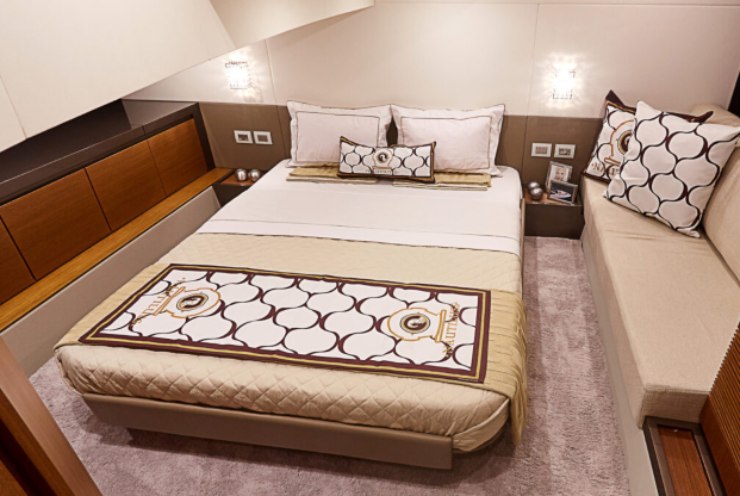 Il pregio del progetto non sta tanto nella ricchezza ridondante dei materiali, quanto nella loro collocazione corretta. La barca non appare mai caricata. Gli ambienti cercano invece un bilanciamento tra luminosità, morbidezza delle superfici e facilità di manutenzione, aspetto decisivo in una barca destinata a uso privato intensivo o a charter selettivo.