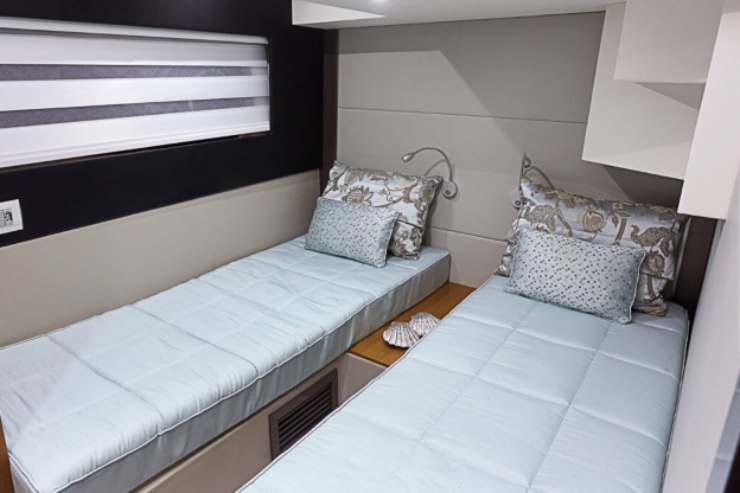 La cabina armatoriale full beam a centro barca è l’ambiente che più beneficia del baglio e della buona altezza interna. È un locale che trasmette volume vero, non illusorio, con superfici sufficienti per contenimento, privacy e uso prolungato. Le cabine ospiti, soprattutto nella configurazione a tre cabine e tre bagni, rendono la 510 GT estremamente competitiva contro numerosi concorrenti europei, alcuni dei quali impongono compromessi più severi sugli spazi di bordo.