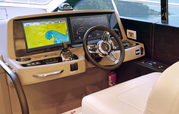 La 510 GT può essere equipaggiata con suite elettroniche di livello alto, spesso basate su multifunction display Raymarine, integrazione radar, ecoscandaglio, VHF e interfacciamento dati motore. La plancia è organizzata per offrire lettura chiara, visibilità discreta e comando intuitivo, con un’impostazione che strizza l’occhio tanto all’armatore esperto quanto al comandante professionista.