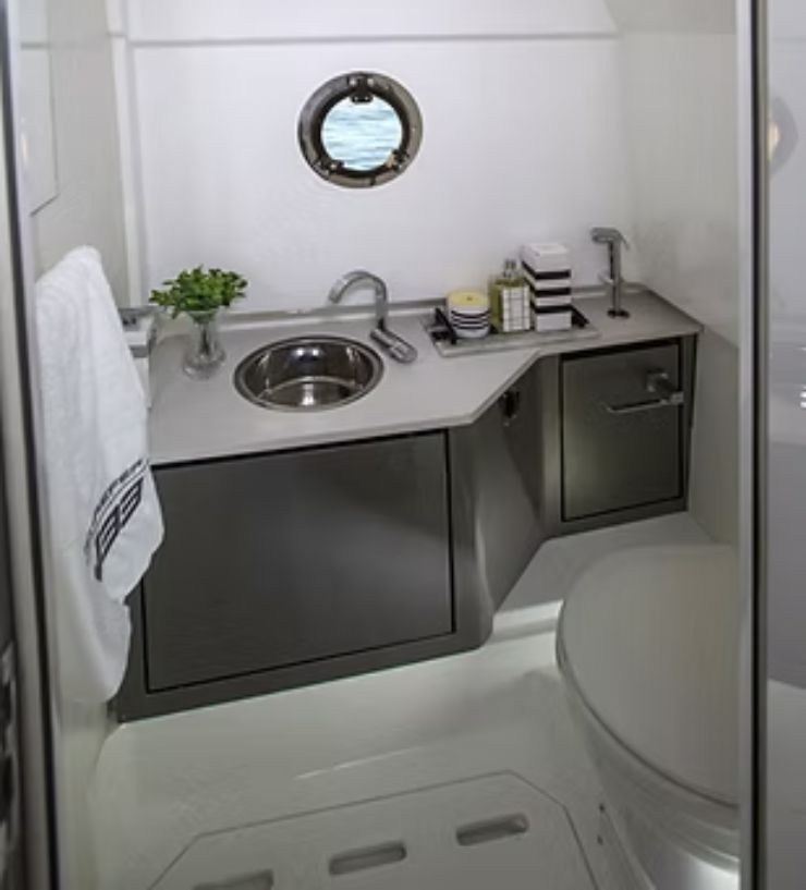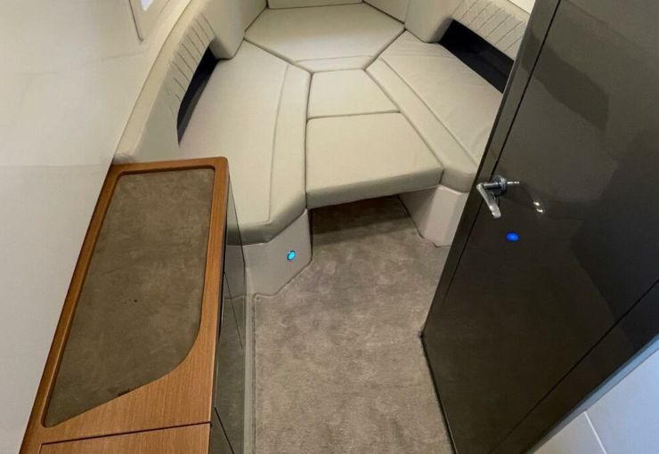 Sottocoperta, il volume è sorprendente per un 33’. L’open-space anteriore si converte in matrimoniale; il bagno separato a tutta altezza con WC elettrico, lavandino e doccia, trasmette un percepito da “mini-cruiser”. Materiali tecnici e superfici lavabili assicurano robustezza e facile manutenzione in contesto charter.