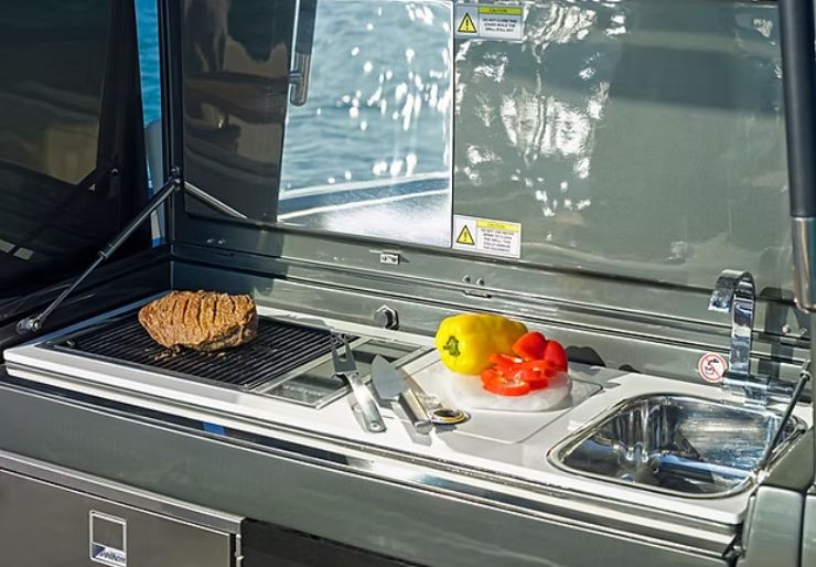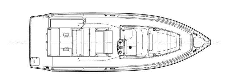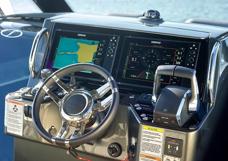La plancia è concepita come glass cockpit con MFD da 12–16″, integrazione dati motori, autopilota Volvo Penta con Shadow Drive nelle versioni con entrofuoribordo e autopilota compatibile per i fuoribordo Mercury; joystick e Active Trim semplificano assetto e manovre. Apparati audio Fusion Apollo con 4–6 speaker, sub e amplificatore nelle versioni premium; verricello ancora con comando remoto; possibilità di stabilizzazione giroscopica Seakeeper a richiesta, molto apprezzata in stand-by pesca o rada.