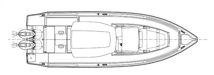 Il V33 nasce “outboard-centric”. L’allestimento più diffuso in Europa e USA prevede twin Mercury Verado V8 300 hp con joystick di ormeggio e integrazione su plancia “glass cockpit” (Garmin/Simrad a scelta dealer). In alternativa, su alcuni mercati sono disponibili gruppi poppieri benzina/diesel (es. Volvo Penta) per chi ricerca plancetta stern-to più ampia o esigenze specifiche di rimessaggio.