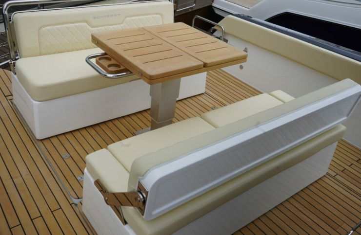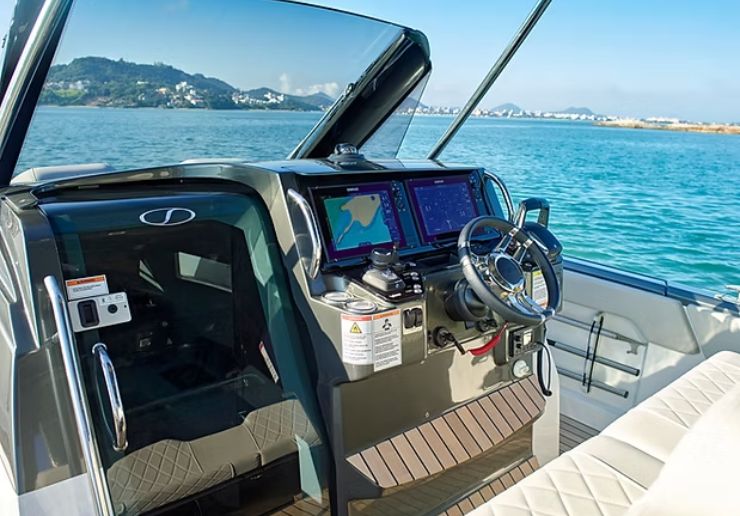La plancia ospita due MFD, indicatori digitali motori, comando joystick, trim tabs e Active Trim. L’ergonomia è curata: linea visiva libera su 360°, parabrezza con montanti sottili, pedana poggiapiedi ampia, seduta doppia con riferimenti laterali. La protezione aerodinamica del T-top e del parabrezza riduce spray e turbolenze attorno al capo, migliorando intelligibilità della strumentazione a velocità sostenute. In opzione, seduta tripla e wiper con lavacristalli.