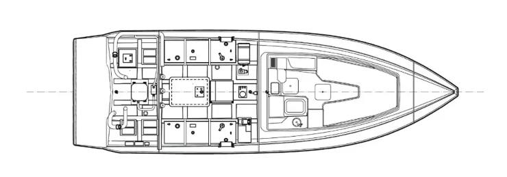 Le proporzioni rivelano una V-carena moderata con pattini longitudinali multipli e chine pronunciate per contenere gli spruzzi; la V a 18,9° punta a un compromesso tra comfort in mare formato e efficienza propulsiva. Il flare di prua è ben marcato per incrementare portanza e asciuttezza del ponte. Il baglio importante rispetto alla lunghezza contribuisce sia alla stabilità primaria sia all’abitabilità esterna (corrimano continui, passavanti protetti, sedute generose a prua e a centro barca).