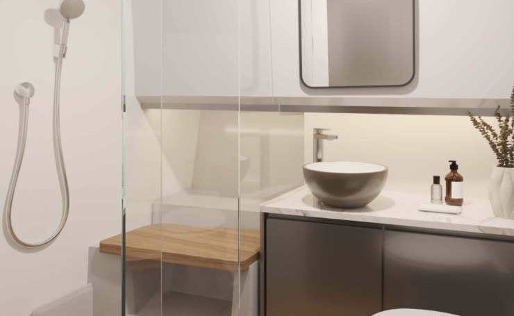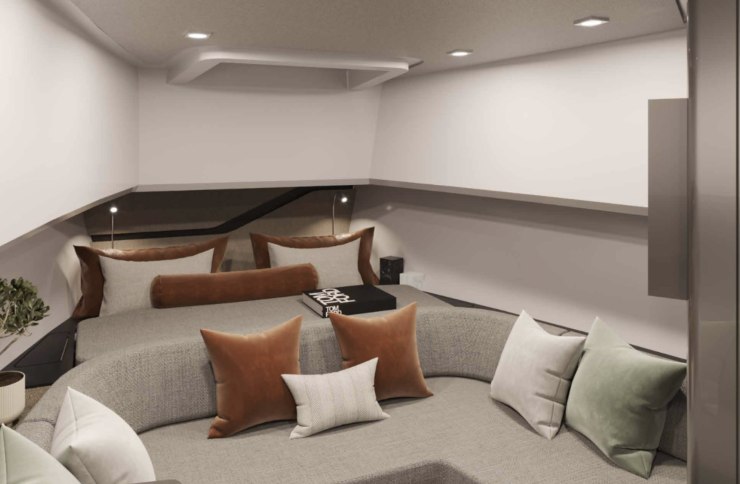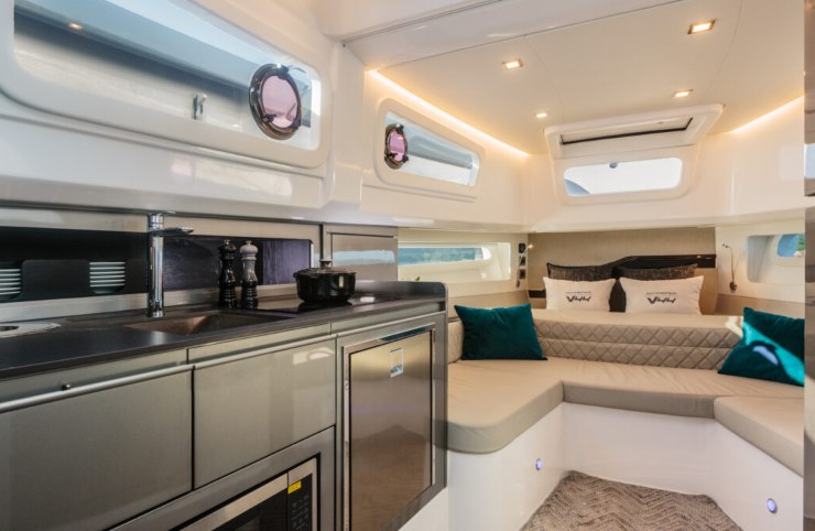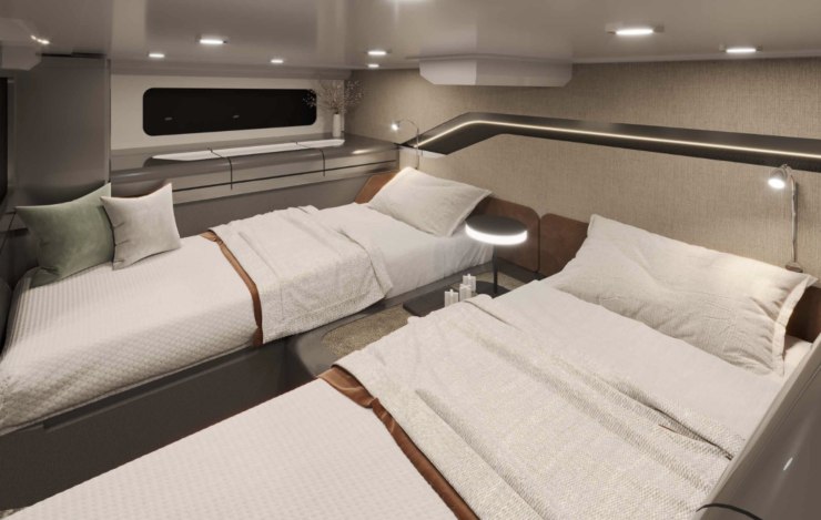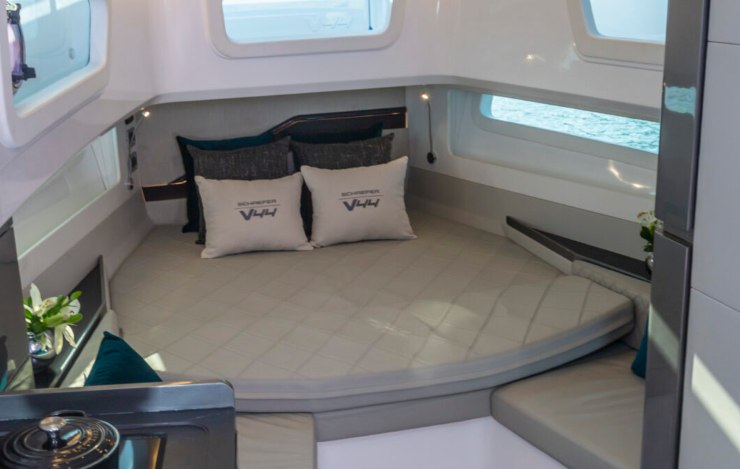 Il layout è il cuore concettuale del V44: cockpit flush a singolo livello dalla plancia fino alla piattaforma poppiera, terrazze idrauliche apribili su entrambi i lati, walkaround profondi e un ampio prendisole di prua. Sotto coperta trovano posto una dinette prodiera convertibile in matrimoniale e una cabina mezzanave con due letti singoli unibili, oltre a locale bagno separato con doccia, ed una cucina con top in Silestone. Finiture, pannellature e cromie sono personalizzabili; la qualità percepita è coerente con l’ambizione premium del progetto.