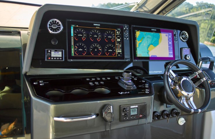 Molti allestimenti dealer includono pacchetti elettronici twin MFD 16” (es. Simrad NSS evo3S), Fusion Audio multizona e TV/antenne opzionali. La logica è quella di una integrazione digitale completa, con rete NMEA2000/brand-specific e gestione semplificata dei sottosistemi.