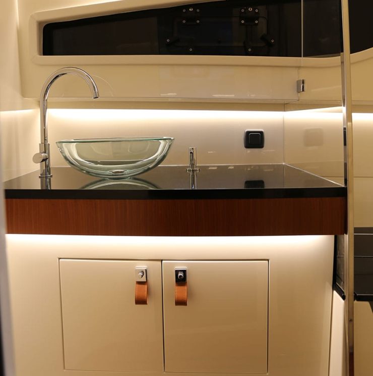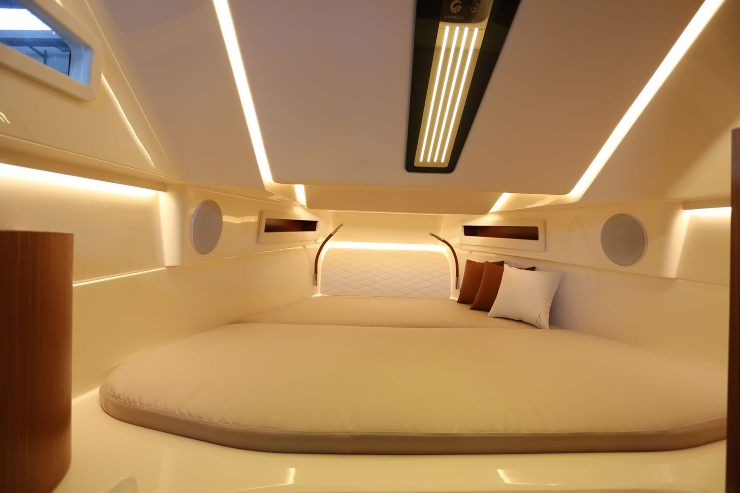 Ogni superficie è studiata per riflettere la luce naturale proveniente dalle finestrature laterali a scafo, creando una sensazione di spaziosità. Le luci a LED integrate nel soffitto e negli arredi amplificano la percezione di profondità. Il risultato è un ambiente che invita al relax, dove ogni dettaglio è pensato per il benessere a bordo.
