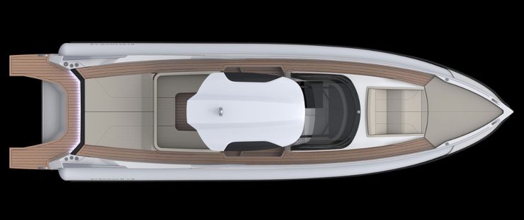 Il ponte principale è pensato come un salotto a cielo aperto. A poppa si trova un grande divano modulare con tavolo telescopico che si trasforma in prendisole. Il passaggio verso prua è ampio e sicuro, con camminamenti larghi e bordi rialzati. L’hard top integra un tettuccio apribile elettronicamente, mentre la piattaforma di poppa può abbassarsi fino a livello dell’acqua per facilitare l’accesso o il varo del tender. Tutto è improntato a una fruibilità naturale, senza soluzione di continuità tra interno ed esterno.