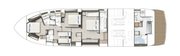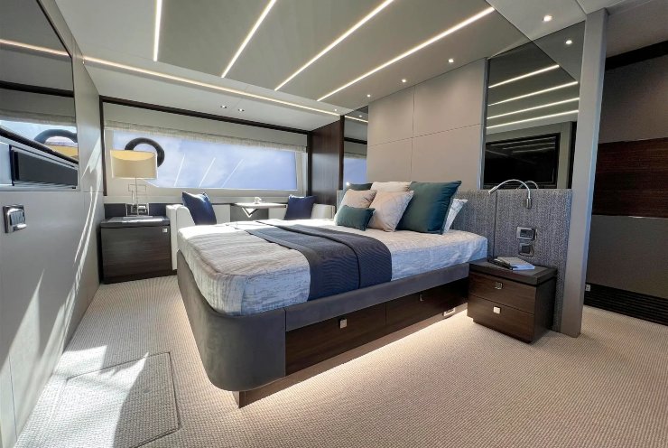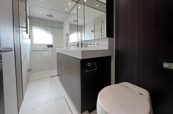 Il layout inferiore a quattro cabine è uno dei motivi principali del successo commerciale del modello. La master a tutto baglio, collocata a centro barca, sfrutta l’area di minore sensibilità ai movimenti e beneficia di grandi finestrature laterali che amplificano percezione di volume e rapporto con il mare. La VIP di prua ha proporzioni corrette e un buon livello di privacy, mentre le due guest laterali permettono grande flessibilità d’uso, inclusa la possibilità, su alcune configurazioni, di trasformare i letti gemelli in matrimoniale.