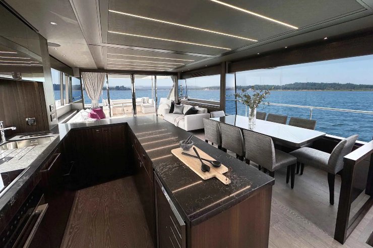 Il main deck lavora su un concetto semplice ma molto efficace: visibilità, continuità e leggerezza visiva. Le grandi superfici vetrate portano luce naturale e aprono il salone verso l’esterno quasi a 360 gradi. L’armatore può scegliere differenti configurazioni di galley, inclusa la soluzione aft galley, particolarmente intelligente per chi vuole valorizzare il rapporto tra cockpit, cucina e servizio. Ne risulta un ponte principale adatto sia alla crociera privata sia a un uso charter raffinato, con percorsi separabili ma mai rigidi.