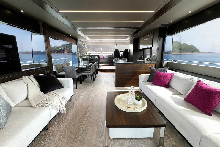 Sotto il profilo stilistico il 76 Yacht conserva tutti i marcatori genetici del brand: profilo filante, ampie superfici vetrate, raccordo armonico tra tuga e flybridge, prua vigorosa ma non aggressiva e finestrature laterali che alleggeriscono la massa della murata. La barca appare moderna senza inseguire un futurismo effimero. È una scelta intelligente, perché un prodotto di questa fascia deve invecchiare bene anche dal punto di vista formale.