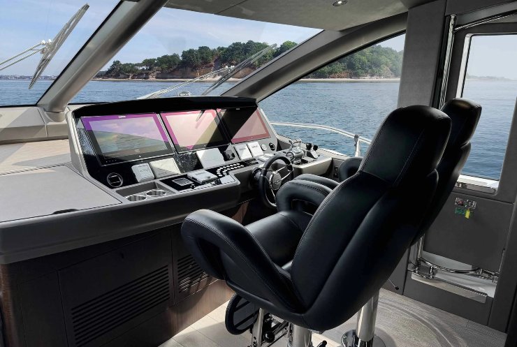 Su una barca di questo livello, la qualità percepita passa anche dalla maturità del pacchetto impiantistico. Il 76 Yacht è configurabile con suite di navigazione complete, doppi display, radar open array, integrazione dei sistemi di monitoraggio e apparati che consentono un controllo molto evoluto della piattaforma. In parallelo, le dotazioni da crociera prolungata possono comprendere doppio generatore, climatizzazione tropicalizzata, watermaker, illuminazione tecnica curata e stazioni supplementari di manovra utilissime nelle marine congestionate o negli ormeggi di poppa tipici del Mediterraneo.