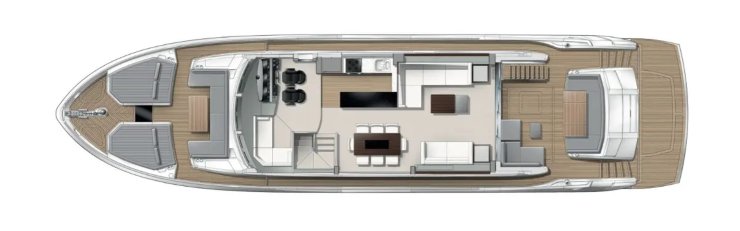 Molto riuscita la distribuzione delle aree open-air. La foredeck lounge, con prendisole gemelli e sedute contrapposte, non è un semplice riempitivo stilistico, ma un vero salotto aggiuntivo. Il flybridge è uno dei punti forti del progetto: può essere configurato con wet bar, area dining, prendisole supplementari, gruetta o spa tub, dimostrando una notevole flessibilità funzionale. A poppa, la piattaforma estesa e il beach club con grill, sedute ribaltabili e doccia contribuiscono a dare allo yacht quella dimensione resort che oggi il mercato reputa essenziale.