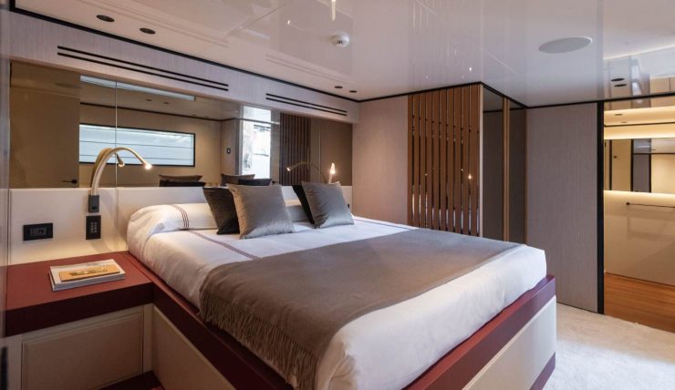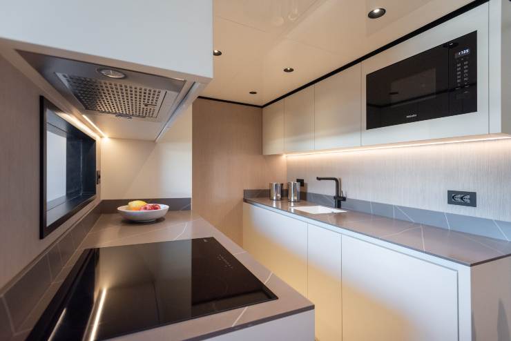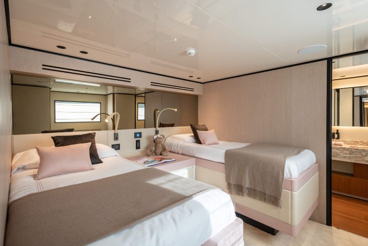 Il cantiere offre un’ampia tavolozza di personalizzazioni per finiture, palette e dotazioni entertainment. La cucina può assumere taglio professionale per charter con chef di bordo; le cabine ospiti includono soluzioni en-suite con box doccia a tutta altezza, stivaggi profondi e illuminazione scenografica ma funzionale.