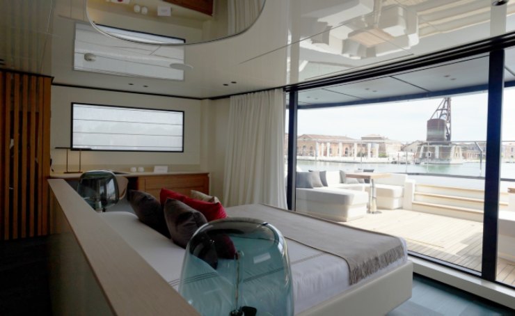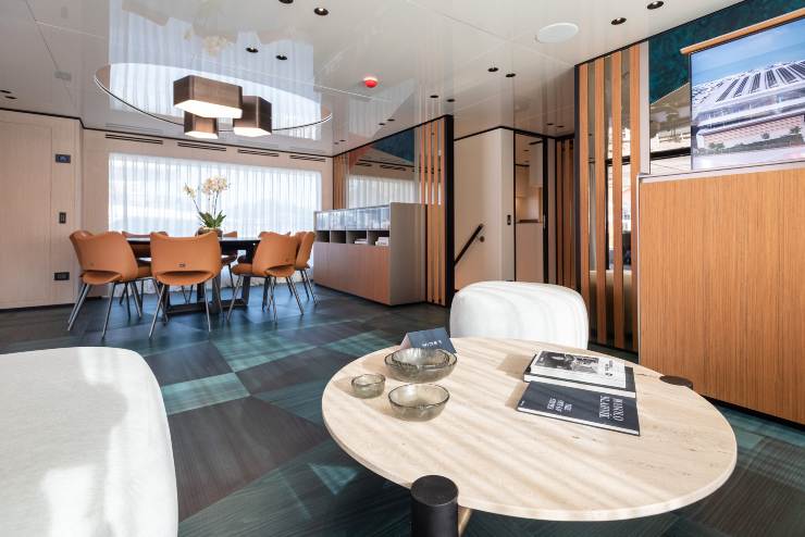 Gli interni alternano essenze e materiali tecnici con un linguaggio coerente al DNA del cantiere: luxury funzionale, privo d’eccessi, che privilegia luce naturale, permeabilità visiva e una gestione acustica curata (isolamenti multistrato, disaccoppiamenti elastici, pannellature fonoassorbenti), fondamentale per valorizzare la silenziosità offerta dal sistema ibrido.