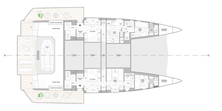 - Lower deck: 4 cabine ospiti con bagni en-suite, accessi indipendenti e connessioni dirette al mare per le VIP laterali grazie ai bulwark abbattibili.