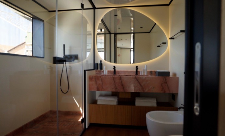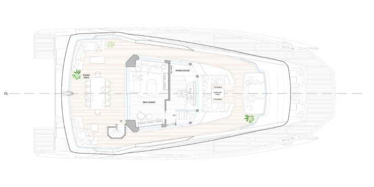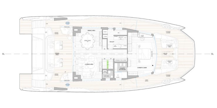 Le carene strette dei due scafi ottimizzano la resistenza d’onda ai regimi di crociera, mentre la sovrastruttura “ponte connettivo” offre oltre 100 m² di main deck con percorsi logici, linee di vista aperte e saloni a tutta larghezza. La suite armatoriale sul ponte principale e la lounge di prua privata liberano le cabine ospiti sui fianchi, alleggerendo carichi e ottimizzando la vivibilità dei ponti inferiori.