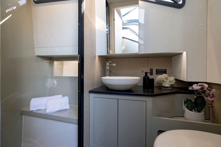 Il bagno è collocato sul lato opposto e dispone di box doccia separato, lavabo, WC marino e vani portaoggetti. Ancora una volta, il linguaggio progettuale è quello di uno yacht compatto piuttosto che di un gommone, con particolare attenzione a superfici facili da pulire, aerazione naturale e illuminazione. L’insieme consente a quattro persone di vivere a bordo anche per più giorni consecutivi senza sensazione di sacrificio.