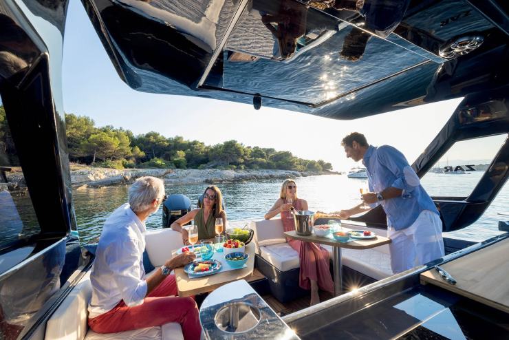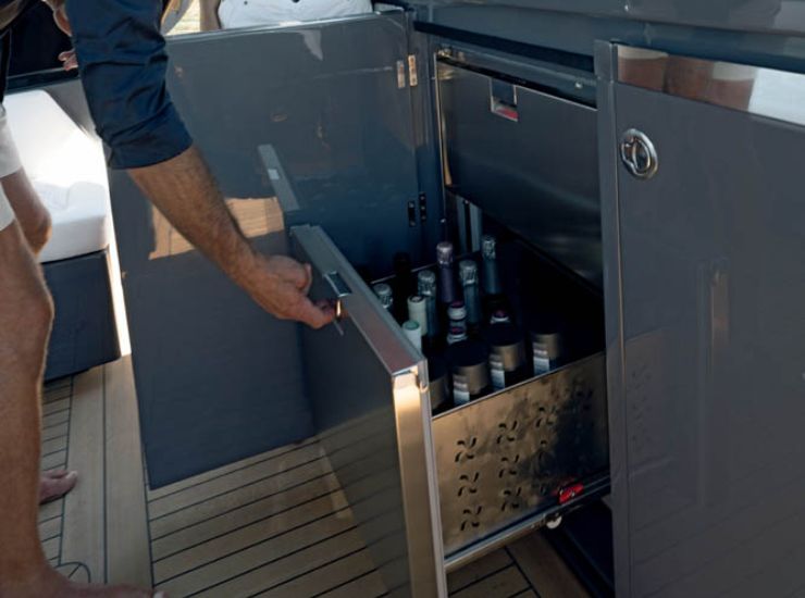 A poppa, il layout privilegia la convivialità: un’ampia dinette si sviluppa attorno a un tavolo centrale, trasformabile all’occorrenza in una grande area prendisole. Subito dietro le sedute di guida troviamo un mobile cucina “full size”, con frigorifero di grande capacità, piastra a induzione, lavello e spazi dedicati alle stoviglie, configurato come una vera cucina all’aperto e non come un semplice wet bar.